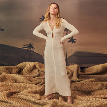 2025 rosun mới đến mở đan sâu V cổ bông Midi Dresses phía trước cutout dài tay áo phụ nữ dệt kim áo len Medi Ăn mặc